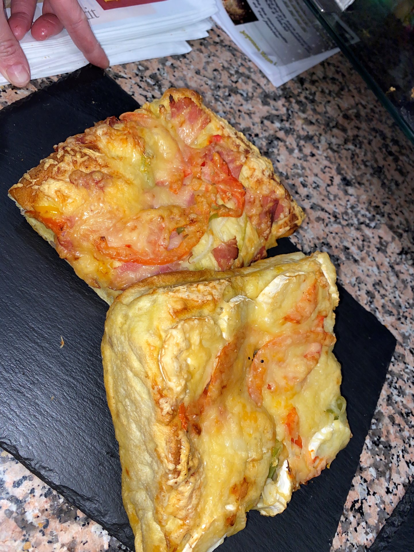 Une base de pain aux maïs avec des poivrons, oignons, tomates, fromage accompagnement au choix :